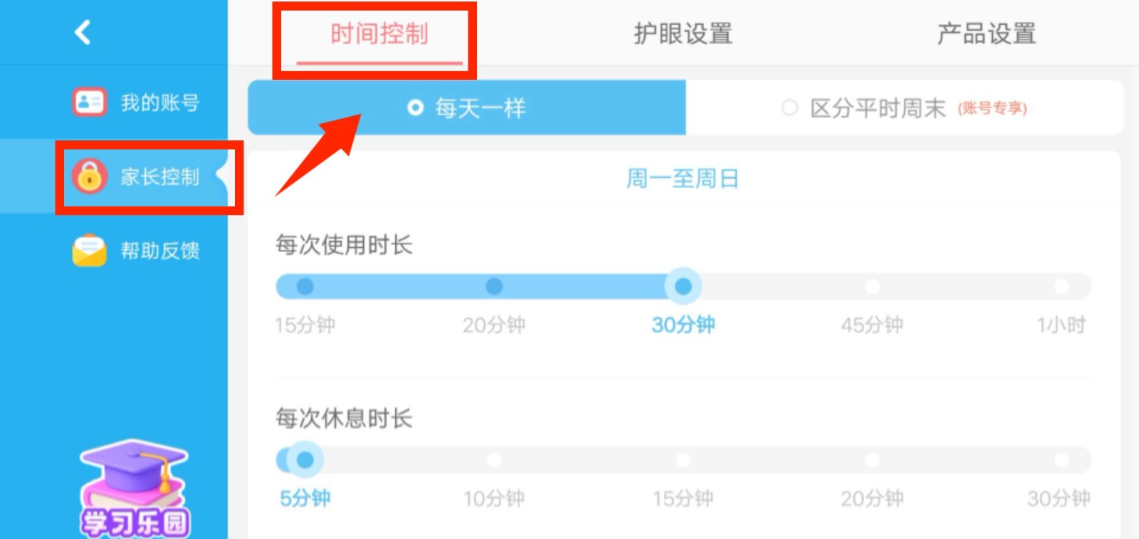 2、在家长控制板块,选择时间控制,能设置孩子每次使用软件的时长和休息时长。