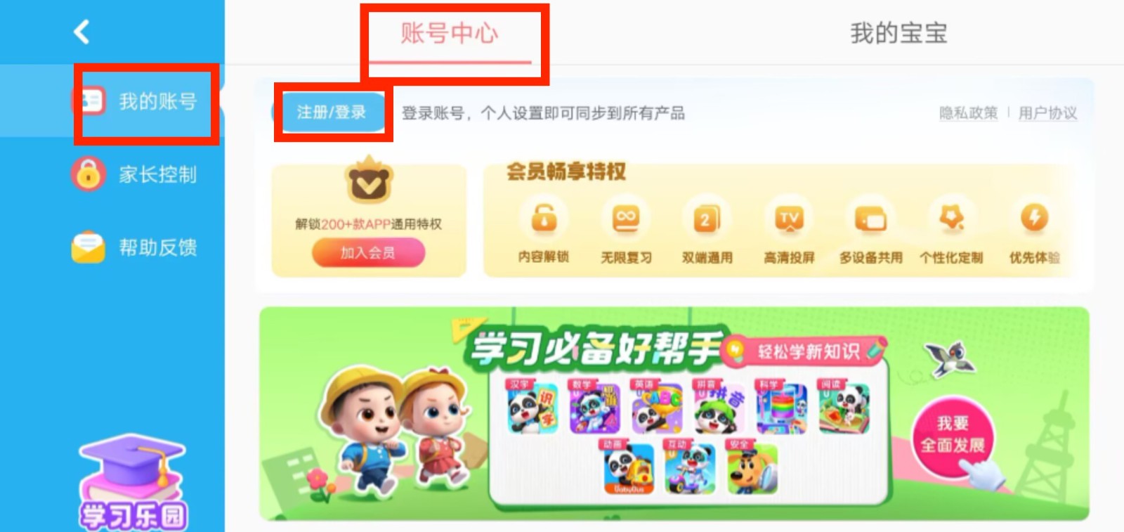 1、点击家长中心,进入账号中心页面,可进行注册或登录操作,同步个人设置。