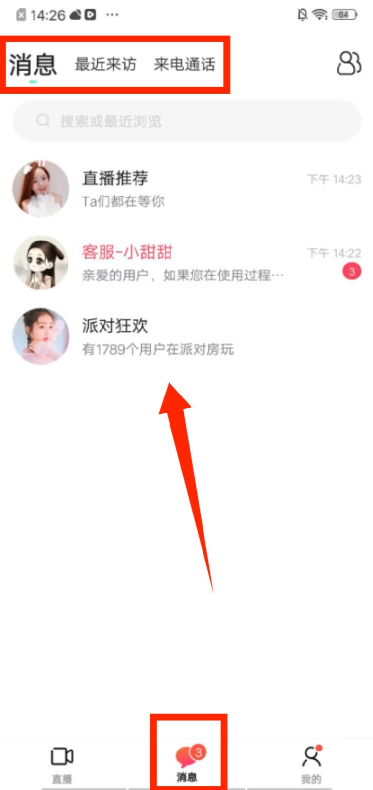 3、点击底部 “消息”,可查看直播推荐、客服消息等,还能切换到最近来访、来电通话板块。