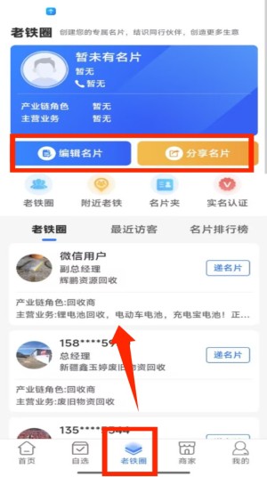 3、然后进入 “老铁圈” 页面,能编辑、分享自己的名片,还可查看附近老铁、名片排行榜里的用户。