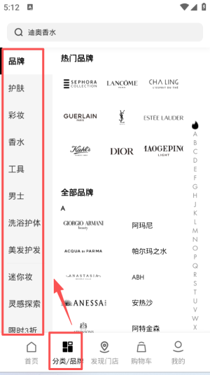 2、点击分类品牌选项,进入对应页面,左侧有品牌、护肤等分类栏,右侧展示热门品牌列表,下方还有全部品牌的字母索引。