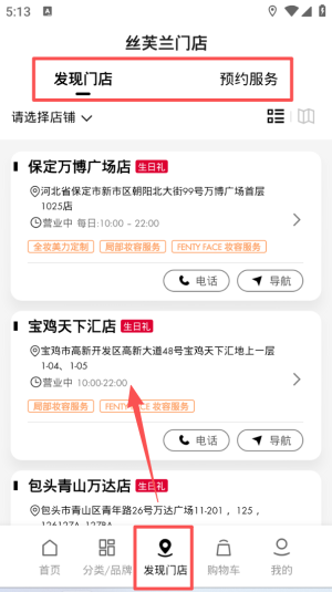 3、切换到发现门店页面,顶部有发现门店和预约服务选项,下方列出不同城市的门店信息,包含地址、营业时间等内容。