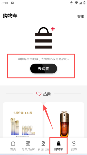 4、打开购物车页面,若购物车为空会提示去购物,下方有热卖商品展示区域,可直接查看心仪商品并加入购物车。
