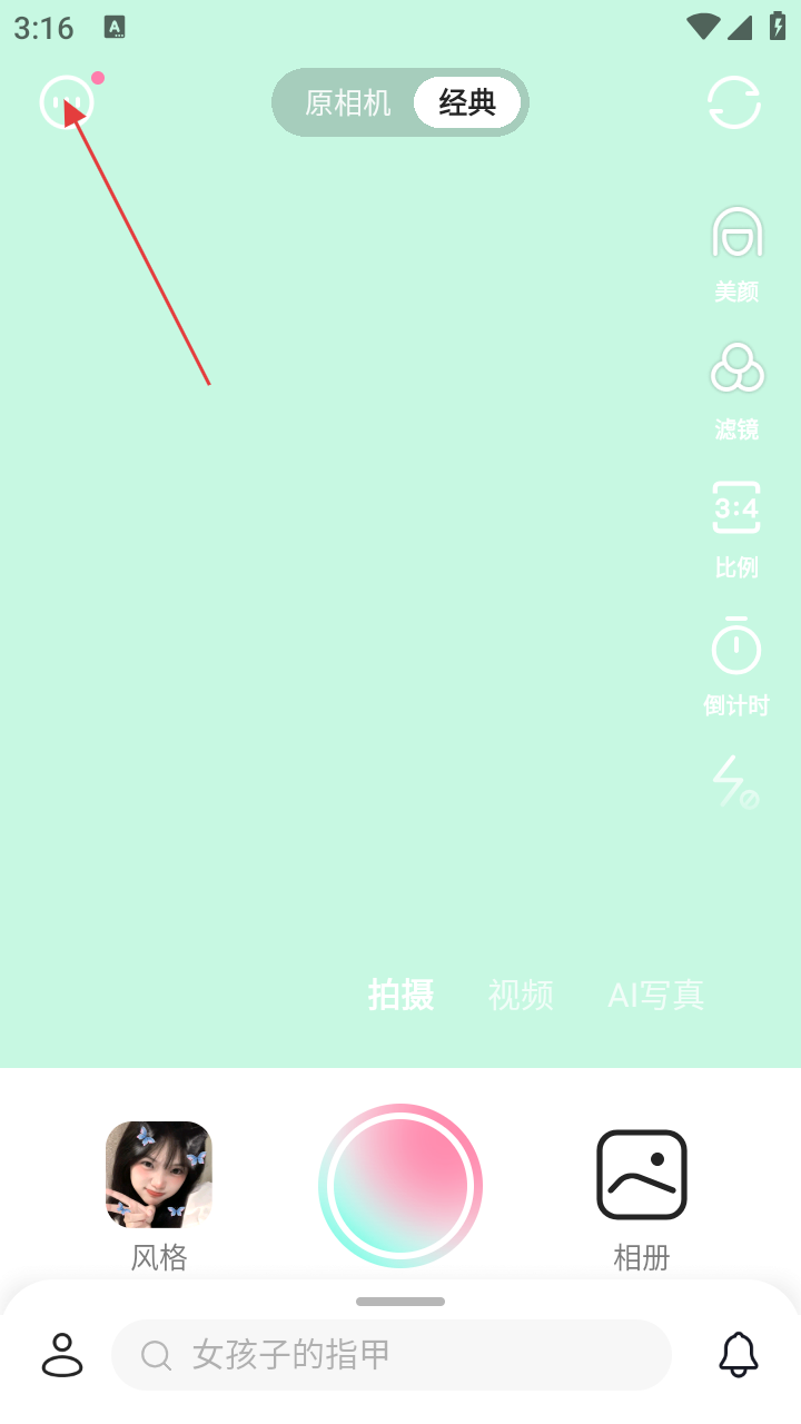 1、在轻颜主界面,点击右下角粉色的【拍摄】图标,可进入拍摄界面,准备进行拍摄操作。