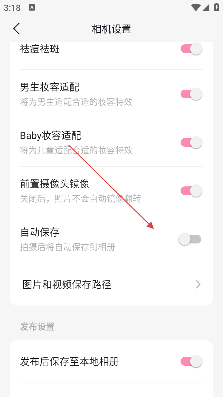 4、在相机设置页面,点击【自动保存】开启功能,即可设置自动保存图片功能。
