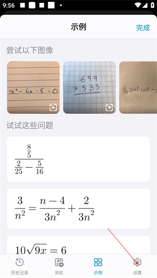 2、在【示例】页面,可查看题目示例并尝试操作,底部导航栏可切换至【历史记录】【测验】等功能模块,点击设置。