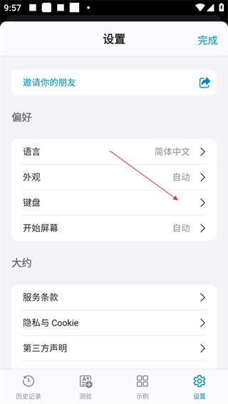 3、进入【设置】页面,可调整【键盘】选项,也可查看服务条款、隐私政策等内容。