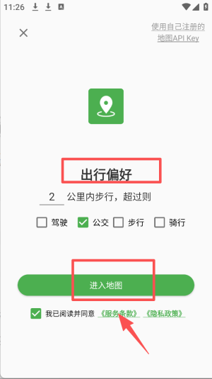2、设置出行偏好,选择“公交”作为出行方式,点击“进入地图”。