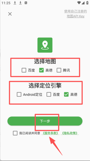 1、选择地图服务,点击“高德”地图和定位引擎,然后点击“下一步”。