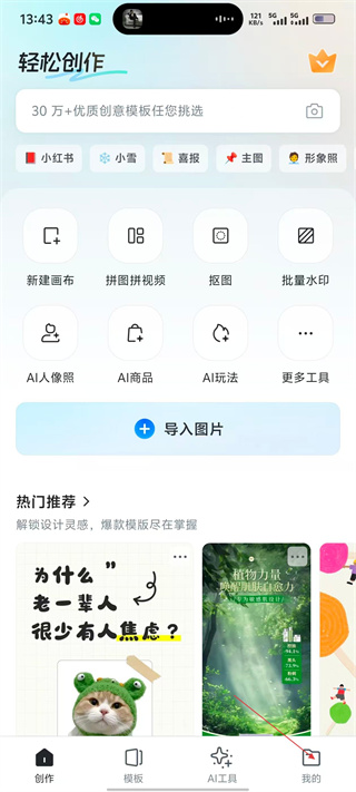 1、在【稿定设计】创作界面,有30万+优质模板可选,点击【我的】可进入个人界面,界面还有新建画布、抠图等功能。