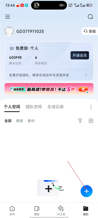 2、进入【稿定设计】个人界面,可查看剩余空间、剩余粮豆等信息,点击蓝色“+”按钮可进行新建或上传操作。