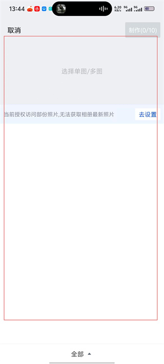 4、上传图片时,若提示无法获取最新照片,可点击【去设置】授权访问照片,之后即可选择单图或多图进行制作。