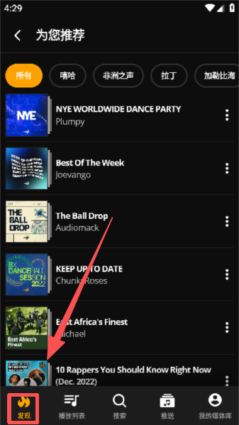 3、点击底部 “发现”,进入为您推荐板块,能看到涵盖嘻哈、非洲之声等多种风格的推荐歌单,探索多元音乐。