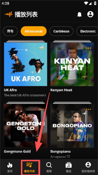 2、点击底部 “播放列表”,可浏览如 UK Afro、Kenyan Heat 等风格多样的音乐歌单,挑选心仪的音乐集合。