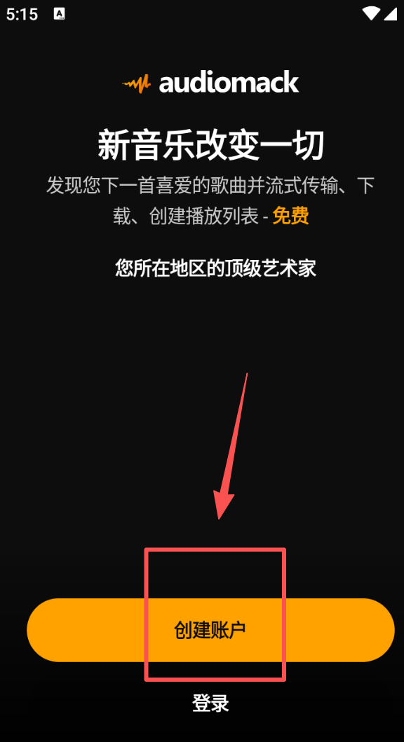 1、在软件初始界面,点击 “创建账户”,可开启个性化音乐体验的第一步,后续能畅享发现、收藏音乐等功能。
