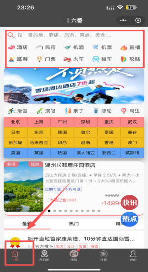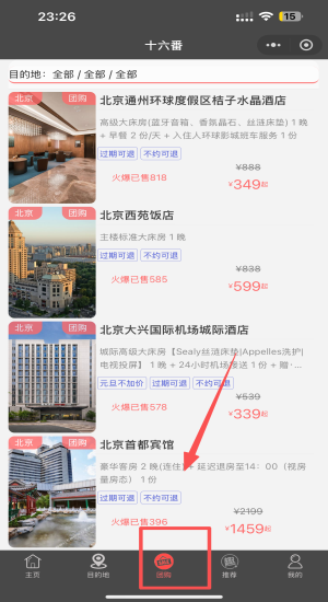 1、在首页搜索栏输入目的地,浏览热门团购与官方推荐酒店信息。