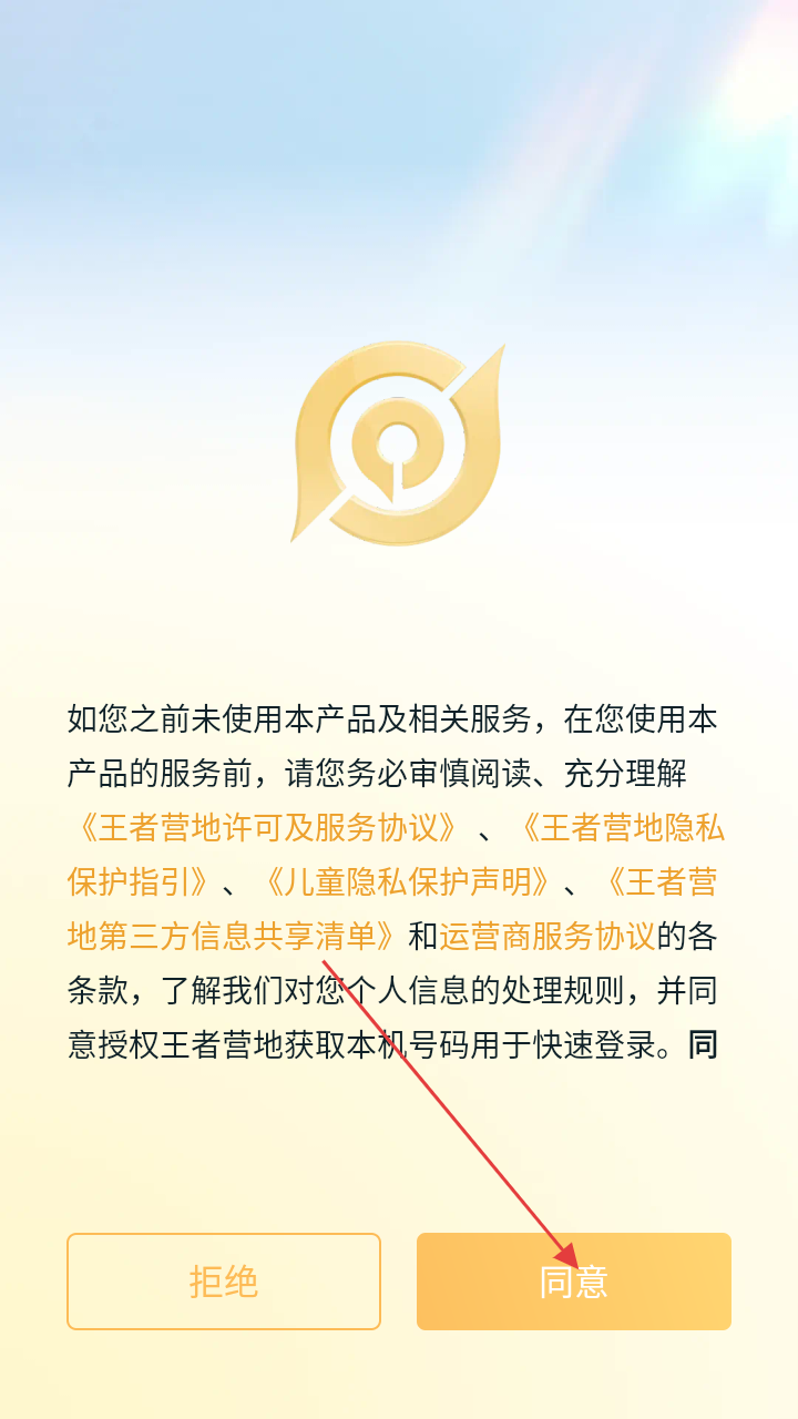 1、首次使用王者营地,会弹出协议说明页面,点击【同意】,即可进入登录环节。