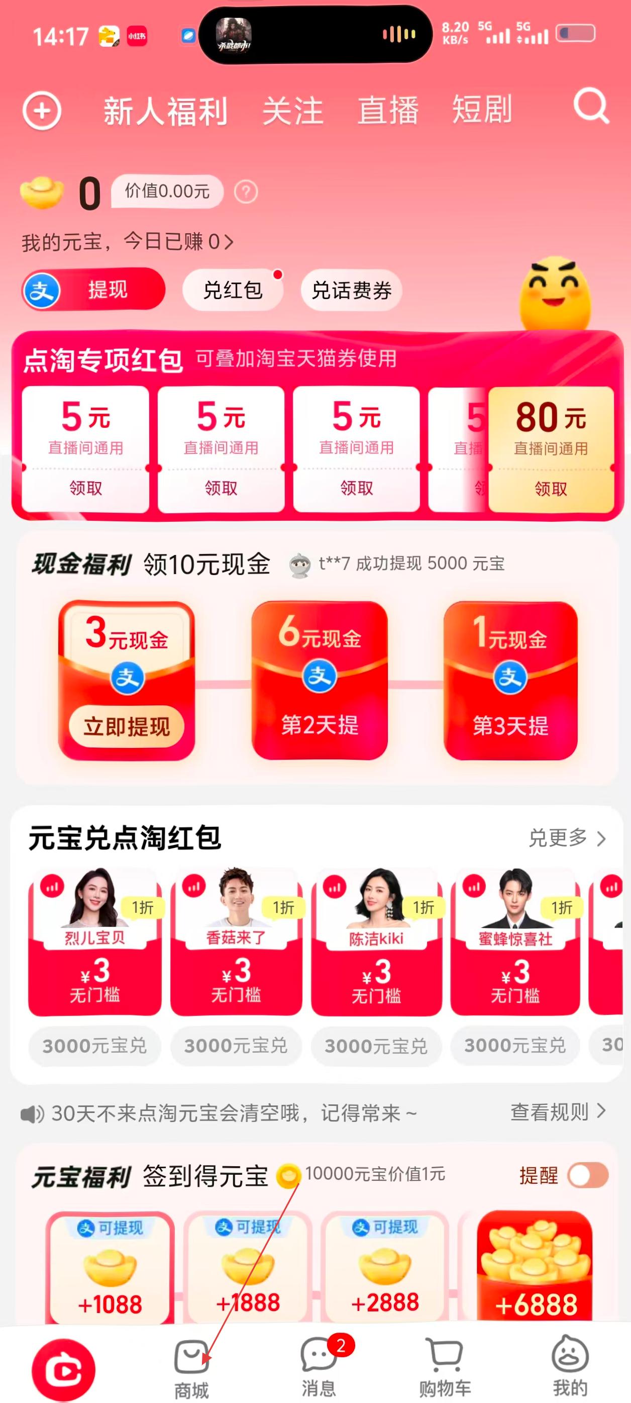 1、打开点淘,首页有【新人福利】等板块,还有元宝提现、兑红包等福利,可先了解这些福利获取方式。