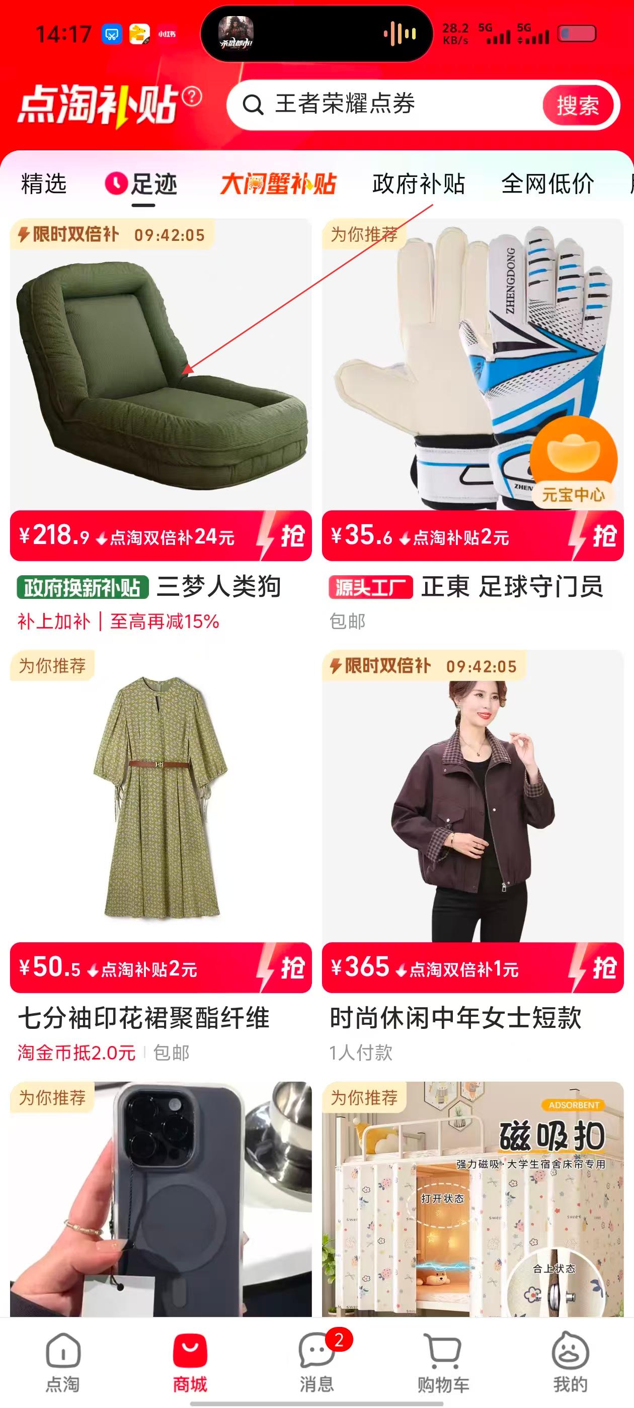 2、点击底部【商城】,进入商城页面,能看到“点淘补贴”等各类商品,可根据需求浏览选购。