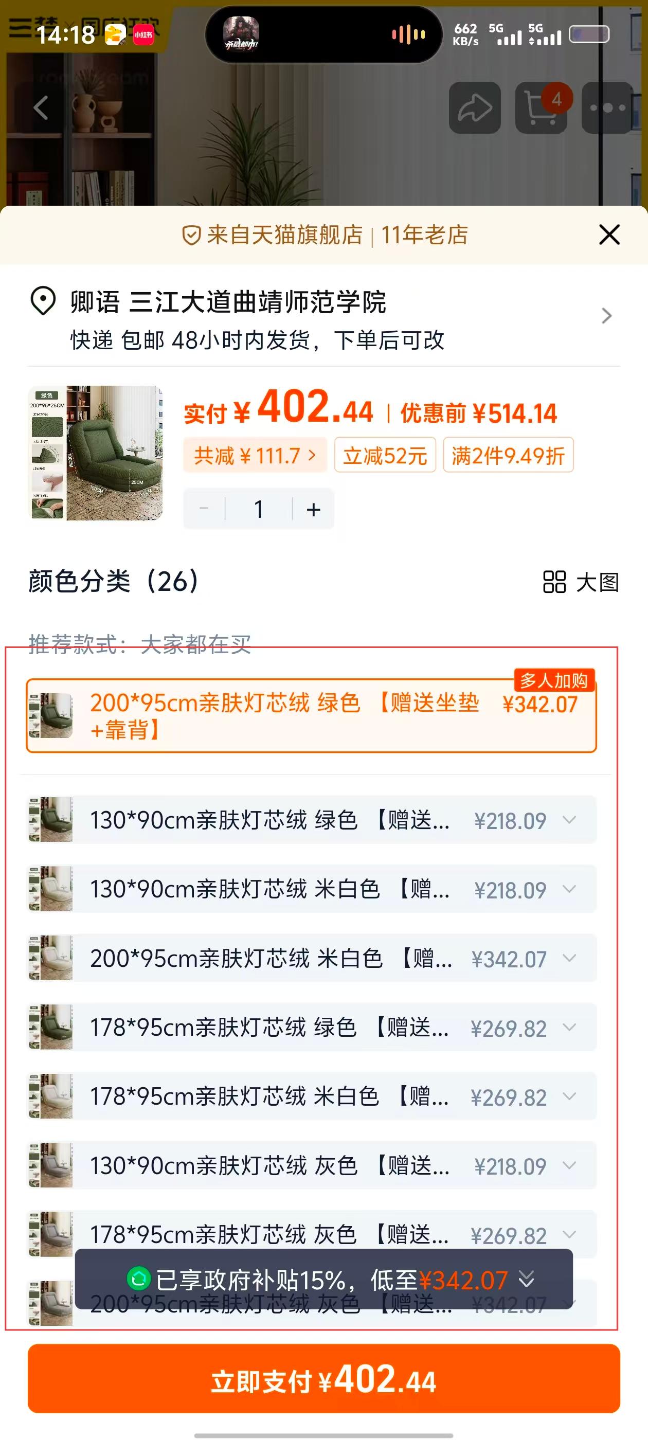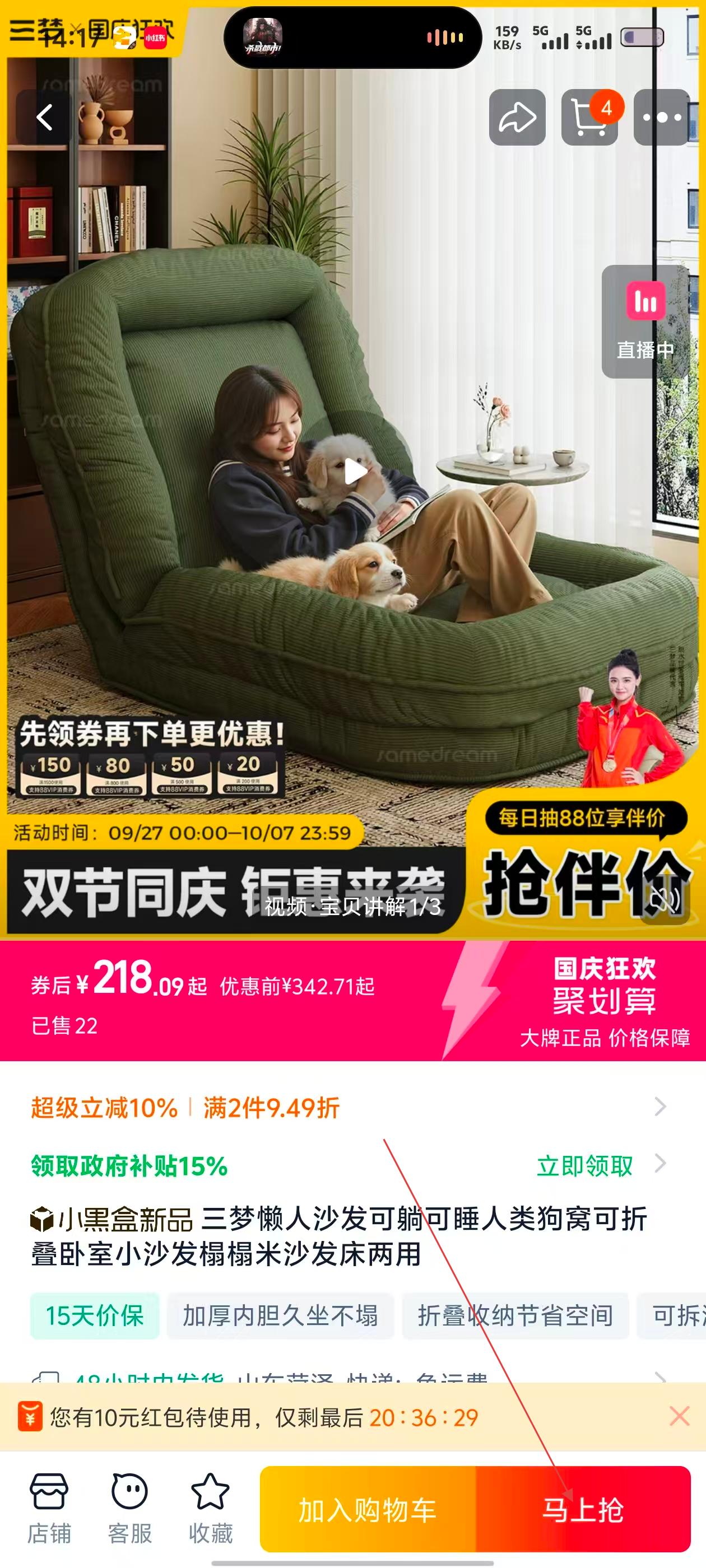 3、在商城看到心仪商品,如这款懒人沙发,点击进入商品详情页,可查看券后价格、优惠活动等信息。