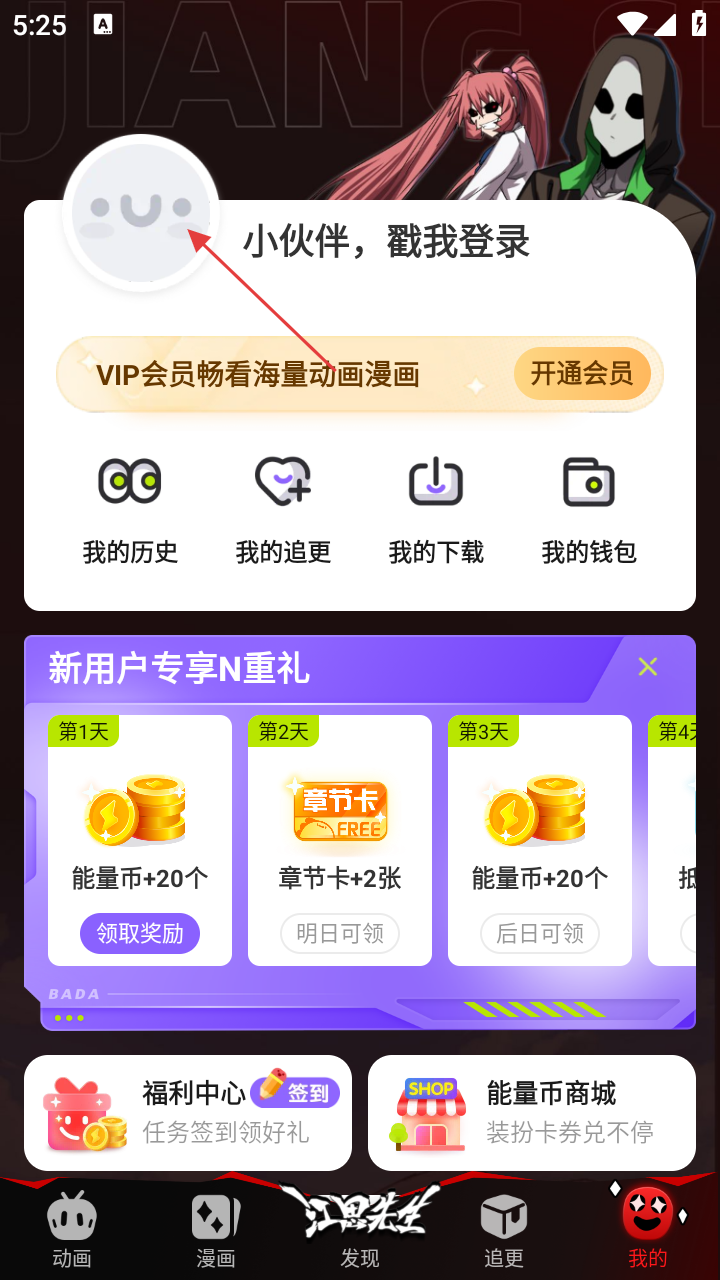2、在【我的】页面,点击头像区域可进入登录界面,还能使用我的历史、我的追更等功能。