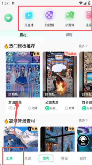 1、在 “工具” 页面顶部,可选择开直播、拍视频等功能,下方素材区展示热门模板,能直接收藏女团舞等模板。
