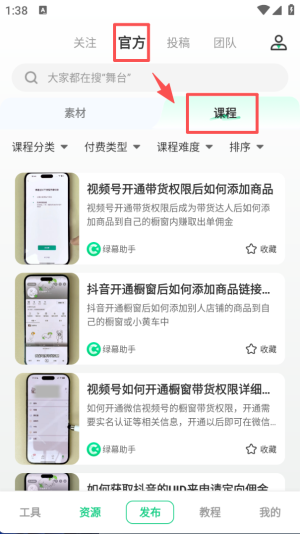 2、切换到 “资源” 的 “课程” 标签,可看到课程分类选项,下方展示视频号开通带货权限等相关课程内容。