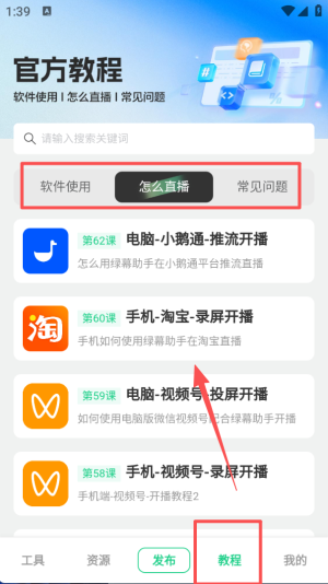 3、进入 “教程” 的 “怎么直播” 分类,能找到电脑端小通推流开播、手机端淘宝录屏开播等不同场景的直播教程。