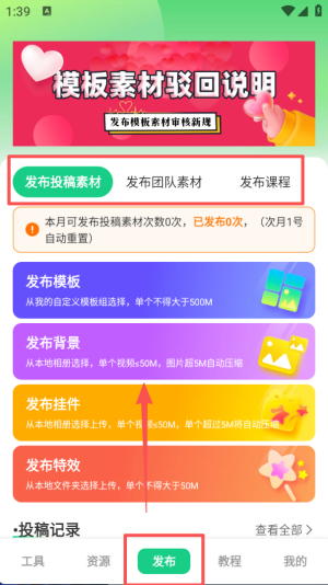 4、打开 “发布” 页面,可选择发布投稿素材、团队素材等内容,还能查看本月素材发布次数及各类素材的上传规则。