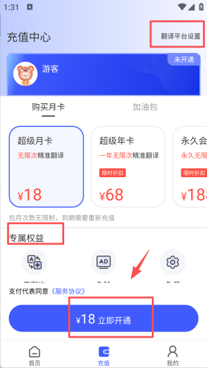 3、在充值板块,可查看翻译平台设置,了解超级月卡等专属权益,选择合适的套餐点击立即开通。