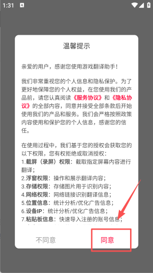 1、使用游戏翻译助手前,需认真阅读服务协议和隐私政策,同意后即可开启使用,享受翻译服务。