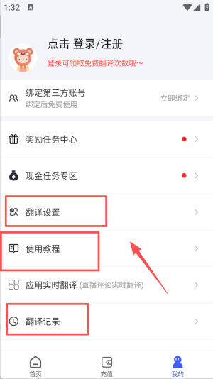 4、进入我的板块,可进行登录注册,查看翻译设置、使用教程,还能查看翻译记录,管理翻译相关事务。