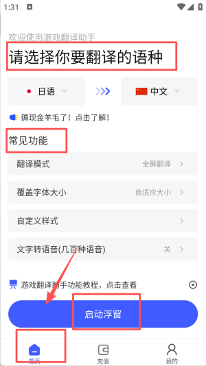 2、进入首页,可选择要翻译的语种,查看常见功能如翻译模式等,点击启动浮窗即可开始翻译操作。