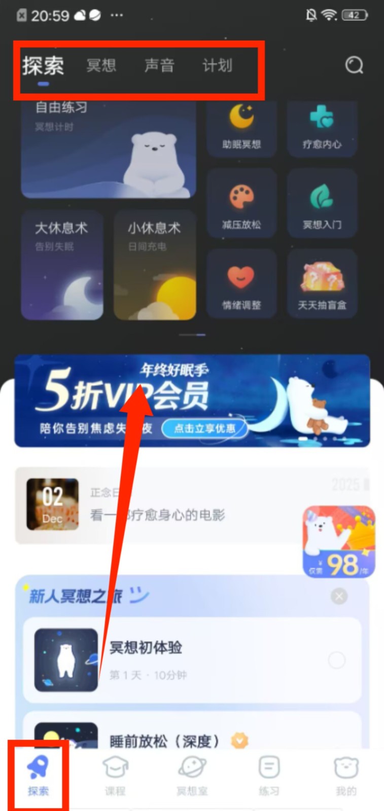 1、进入探索页面,在 “冥想”“声音” 等分类下,可选择助眠、减压类内容,开启对应状态的放松练习。
