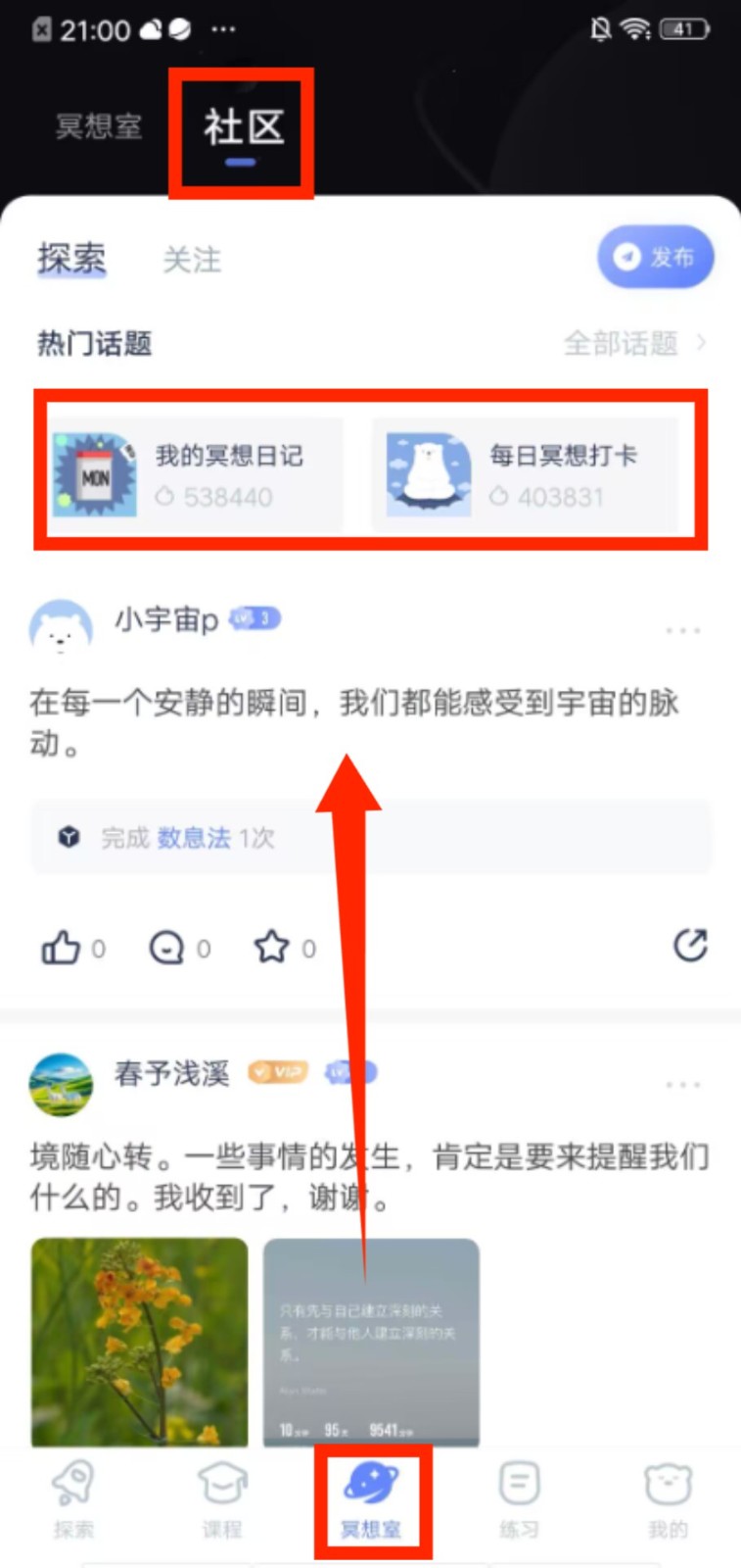 2、切换到冥想室页面,在社区板块参与 “我的冥想日记”“每日冥想打卡” 等话题,分享练习感受。