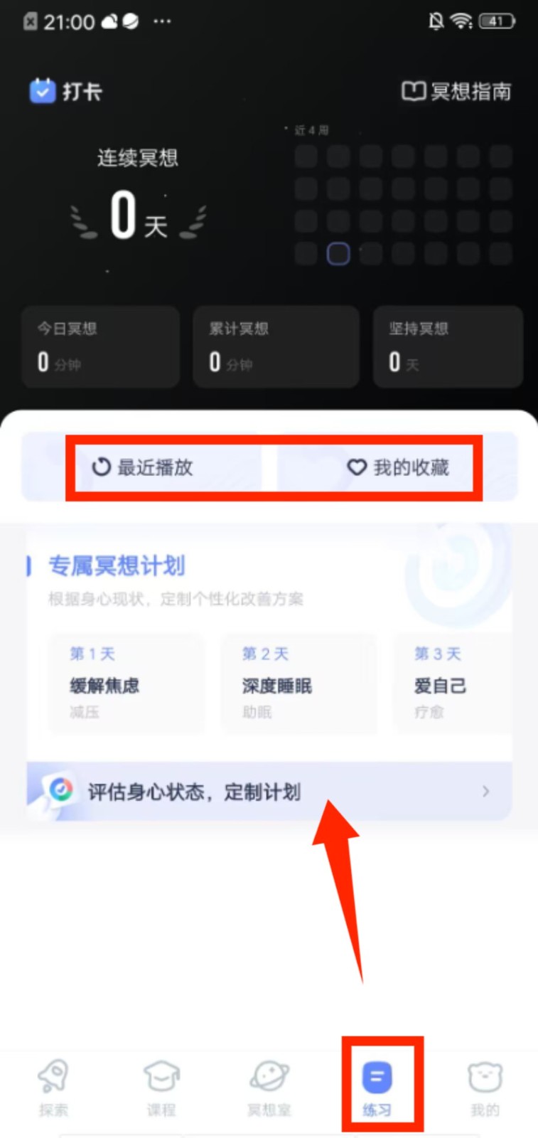 3、打开练习页面,通过 “最近播放”“我的收藏” 板块,可快速找回之前的练习内容,继续冥想节奏。