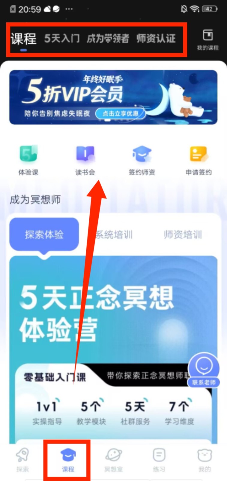 4、进入课程页面,选择 “体验课”“读书会” 等入口,可参与冥想入门类课程,学习基础的练习方法。