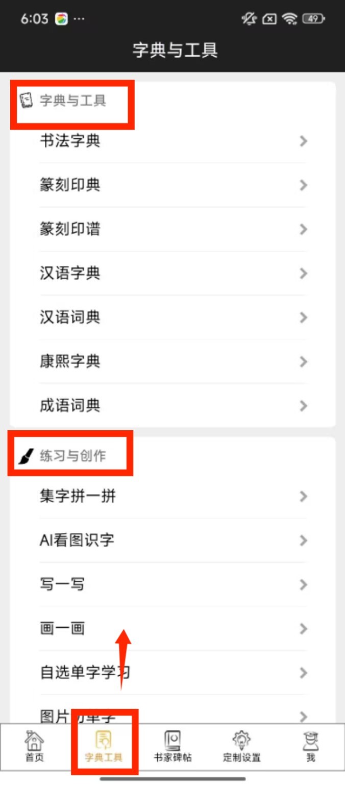 2、切换至 “字典工具” 页面,能在字典与工具板块查字词,也可在练习与创作区进行集字、识字等练习。