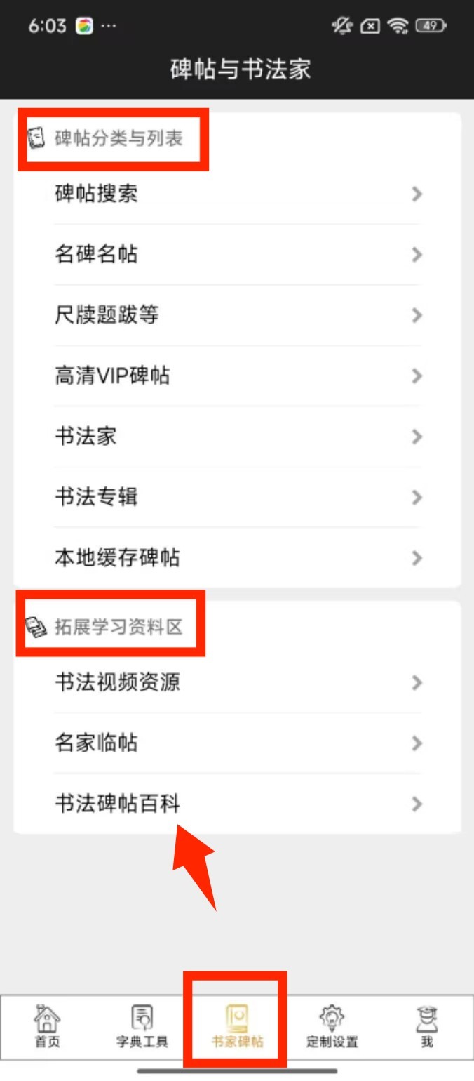 3、进入 “书家碑帖” 界面,通过碑帖分类列表查找名碑名帖,还能在拓展资料区获取书法视频等学习内容。