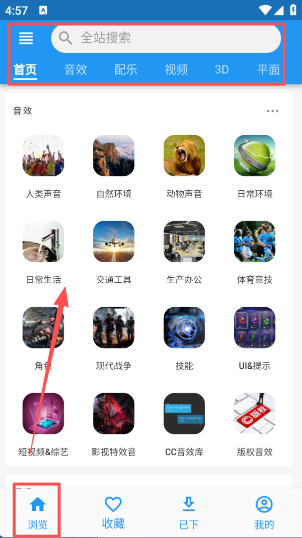 1、点击底部 “浏览” 进入首页,借助顶部搜索栏查找内容,也能通过音效、配乐等分类入口筛选素材。