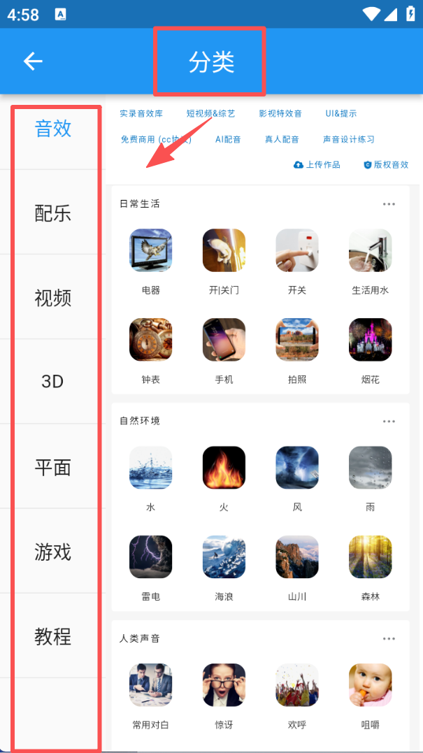 2、进入分类页面后,在左侧分类栏选定类别,右侧会呈现对应素材,可精准定位所需的音效内容。