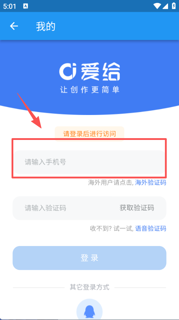 4、切换到 “我的” 界面,需先完成账号登录,后续才能访问个人相关功能,管理已获取的素材内容。
