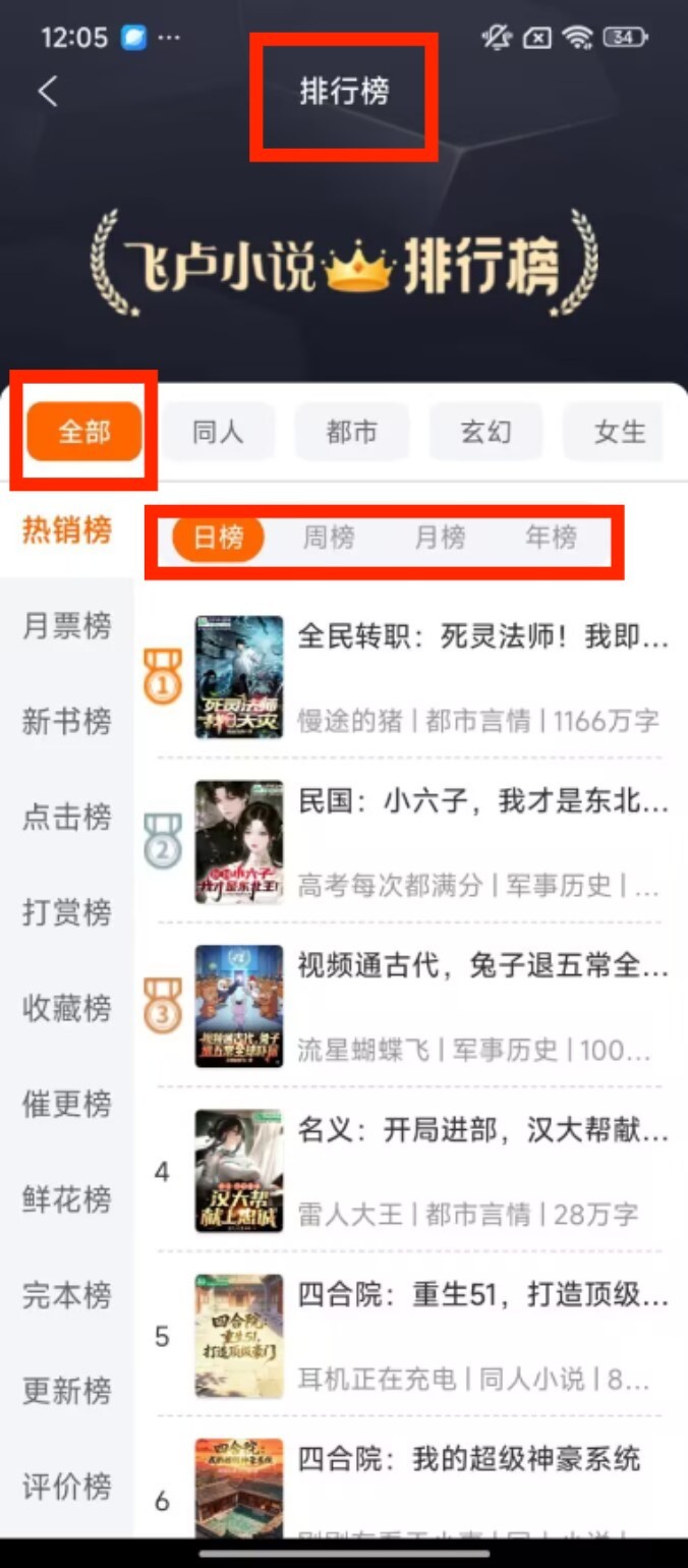 2、找到排行榜入口进入,选定 “全部” 分类,再切换至 “日榜”,就能查看当日热门内容排行。