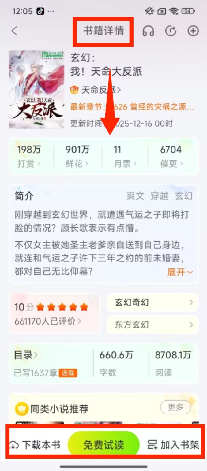 4、打开书籍详情页,能查看作品简介、数据等信息,还可选择下载、试读或加入书架等操作。