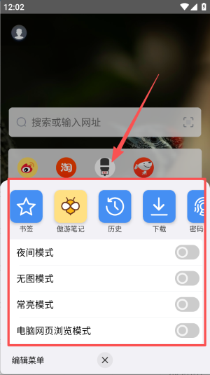 4、进入菜单开启“夜间模式”与“电脑网页浏览模式”,护眼且看完整版。