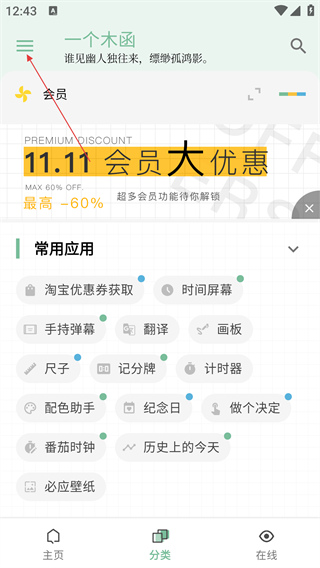 1、在一个木函主界面,点击左上角三条横线图标,可展开功能菜单,查看登录、应用管理等选项。