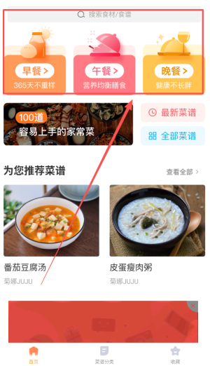 1、打开家常菜后,用户进入主页后可看到最新的热门菜谱推荐,便于选择自己感兴趣的菜品。