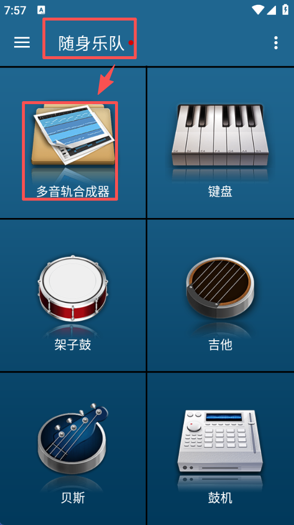 1、进入随身乐队页面,可看到多音轨合成器、键盘等功能入口,点击多音轨合成器,即可进入对应的创作界面。