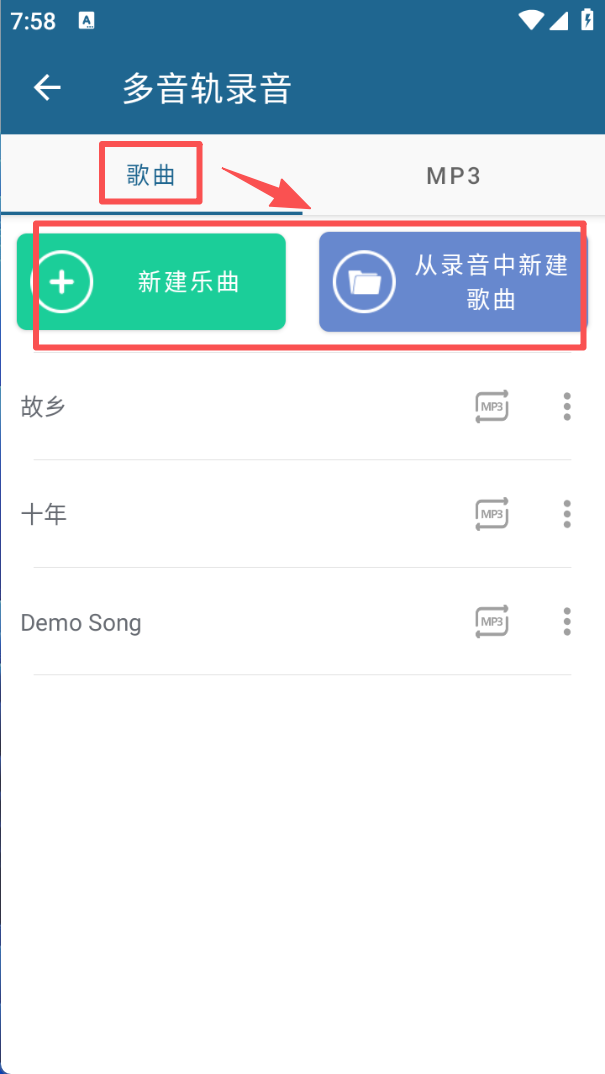 2、在多音轨录音页面,选择 “歌曲” 分类,点击 “新建乐曲” 或 “从录音中新建歌曲”,就能开启新的创作项目。