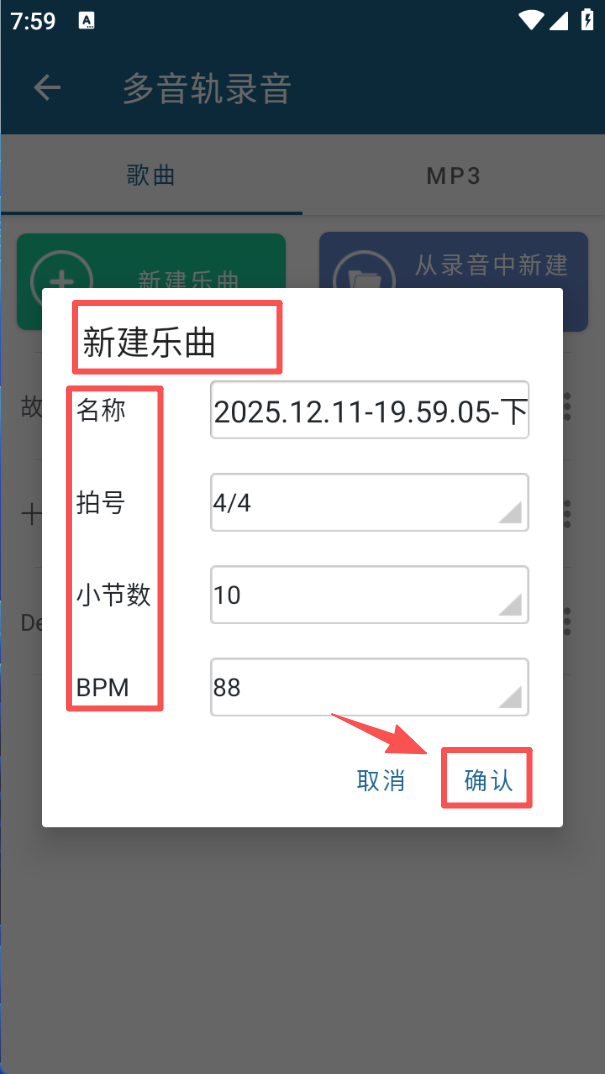 3、点击 “新建乐曲” 后,会弹出设置窗口,可调整名称、拍号等参数,确认设置后点击 “确认” 即可生成新乐曲。